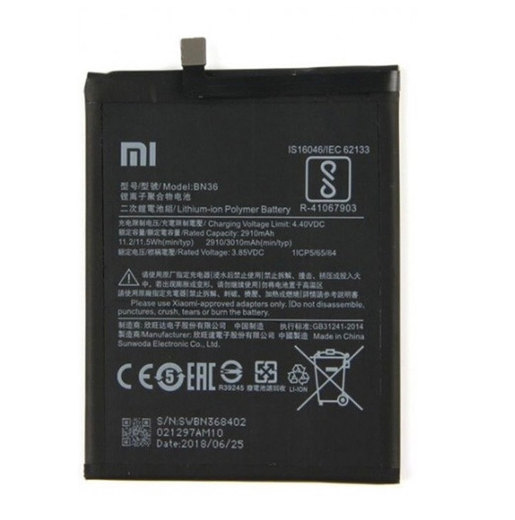 باطری اصلی گوشی شیائومی Mi A2 (Mi 6X) مدل BN36 از جنس پلیمر لیتیم بوده و با ظرفیت 3000 میلی آمپر بر ساعت تولید شده است.