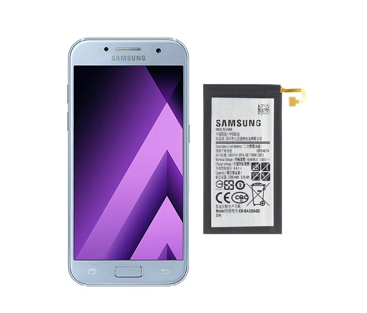 کمپانی سامسونگ درگوشی Samsung Galaxy A3 2017 از باتری لیتیوم یون (Lithium-ion ) با کد فنی EB-BA320ABE استفاده کرده است. این باتری دارای ظرفیت ۲۳۵۰ میلیآمپر – ساعت و ولتاژ ۳/۸ ولت است.