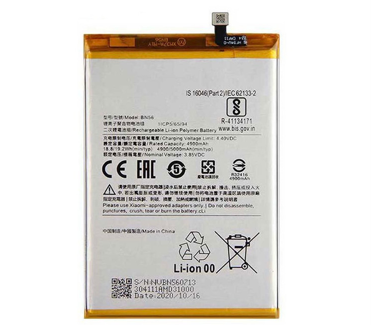کمپانی شیائومی درگوشی شیائومی Xiaomi Redmi 9C از باتری لیتیوم پلیمری (Lithium-ion polymer) با کد فنی BN56 استفاده کرده است. این باتری دارای ظرفیت ۵۰۰۰ میلیآمپر – ساعت و ولتاژ ۳/۸ ولت است.