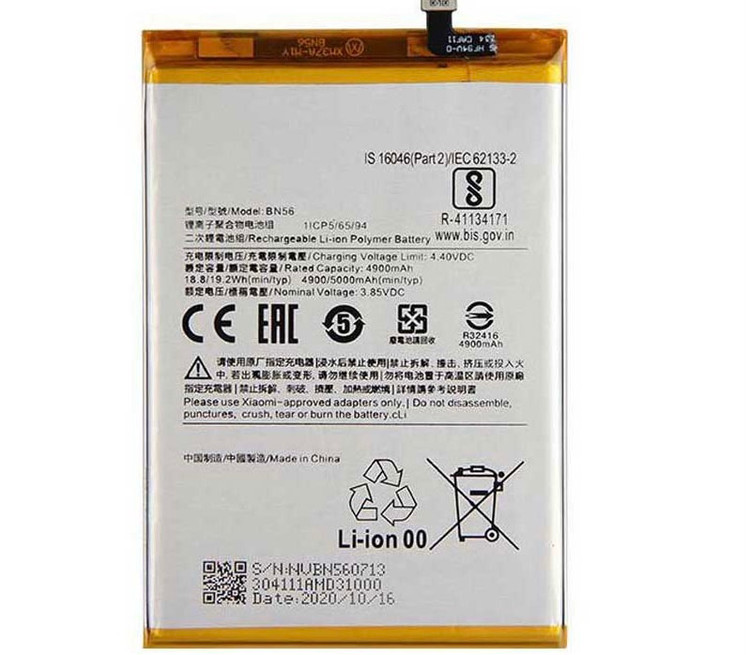 کمپانی شیائومی درگوشی شیائومی Xiaomi Redmi 9C از باتری لیتیوم پلیمری (Lithium-ion polymer) با کد فنی BN56 استفاده کرده است. این باتری دارای ظرفیت ۵۰۰۰ میلیآمپر – ساعت و ولتاژ ۳/۸ ولت است.