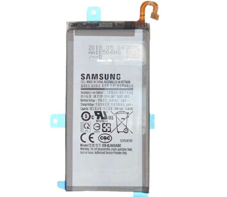 کمپانی سامسونگ درگوشی ۲۰۱۸ Samsung Galaxy A6 Plus از باتری لیتیوم یون (Lithium-ion ) با کد فنی EB-BJ805ABE استفاده کرده است. این باتری دارای ظرفیت ۳۵۰۰ میلیآمپر – ساعت و ولتاژ ۳/۸ ولت است.